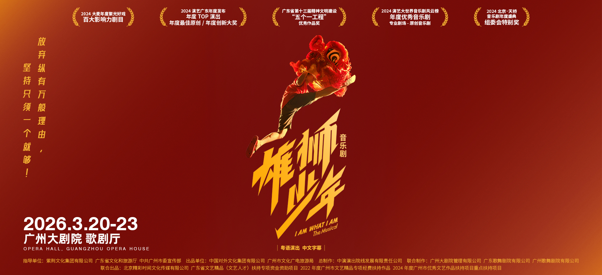 该剧自2024年首演以来,席卷全国多座城市,全网破8亿曝光,斩获广泛关注及口碑,荣获广东省第十三届精神文明建设“五个一工程”优秀作品奖、2024北京天桥音乐剧年度盛典组委会特别奖、2024上海演艺大世界音乐剧风云榜年度优秀音乐剧等多项殊荣。3月20日至23日,音乐剧《雄狮少年》将在广州大剧院连演六场,并前往廊坊、上海、泉州开启2026巡演,用地道粤语呈现岭南人文风情和拼搏进取的雄狮精神。